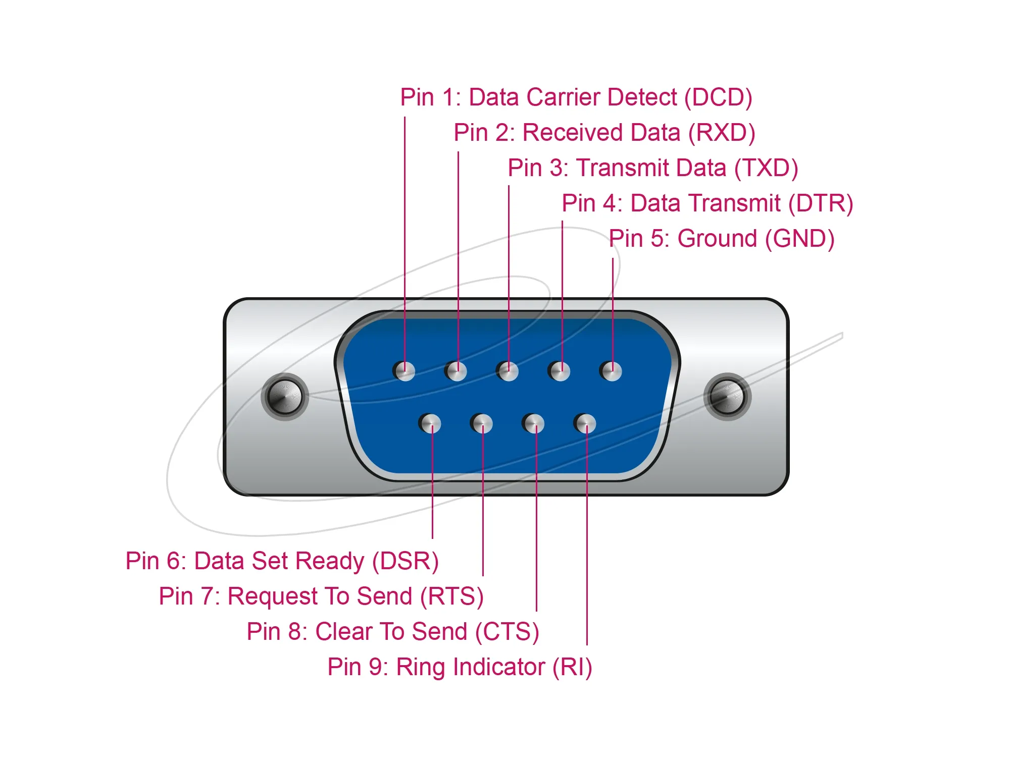 - Signals: TxD, RxD, RTS, CTS, DTR, DSR, DCD, RI, GND