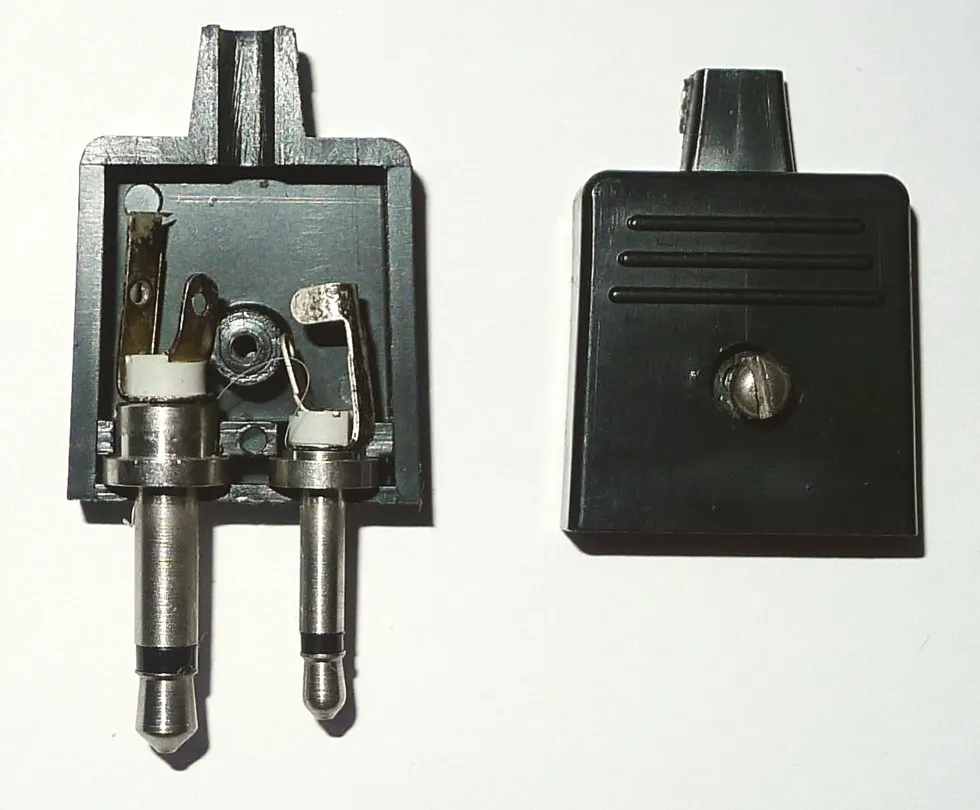 Dubbele Jack connector, male 2,5 mm + 3,5 mm mono. Onder andere gebruikt voor aansluiting van microfoon en afstandsbediening of headset op cassetterecorder of portofoon.