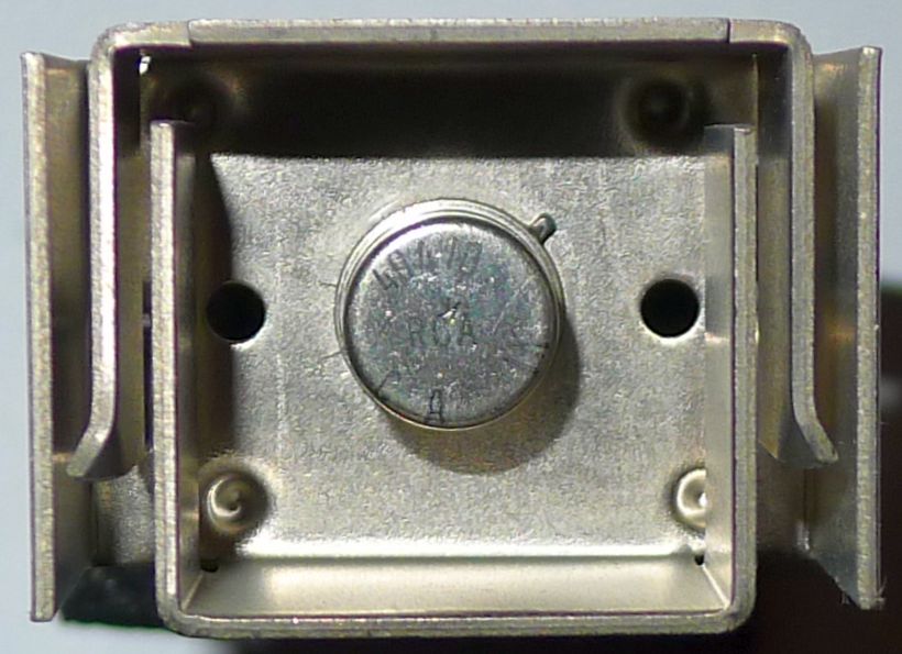 RCA 40410 90V 0,7A 3W PNP transistor in TO-39 behuizing met koellichaam.