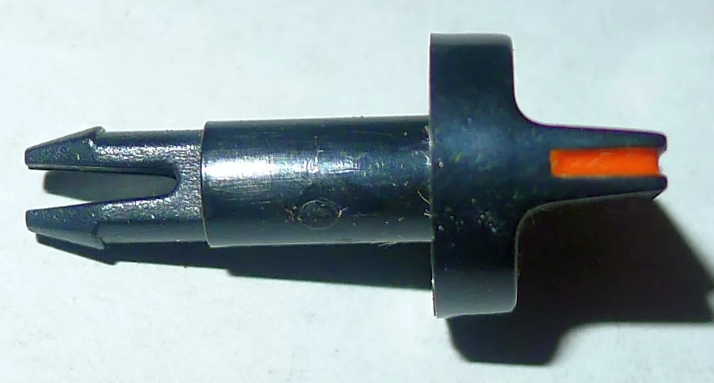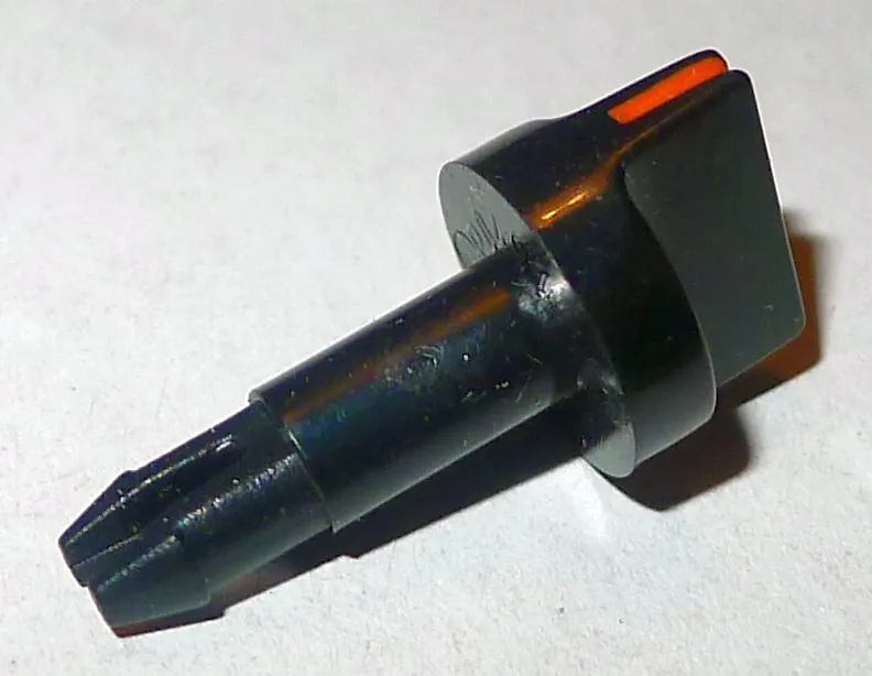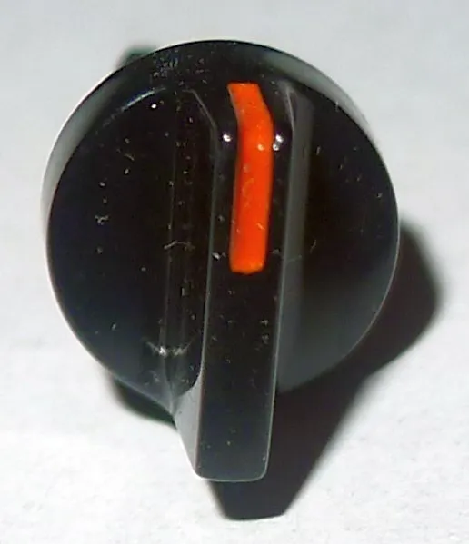 Rond zwart knopje met rechte knevel en rood streepje. Steekas met uiteinde dat in het gat van een potmeter klemt.