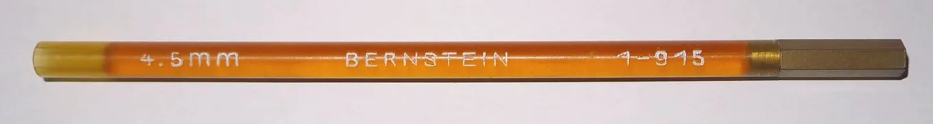 Bernsteinit trimsleutel 140 mm lang met 4,5 mm buitenzeskant, 1 kant messing, 1 kant bernsteinit.