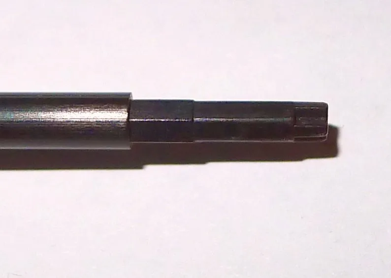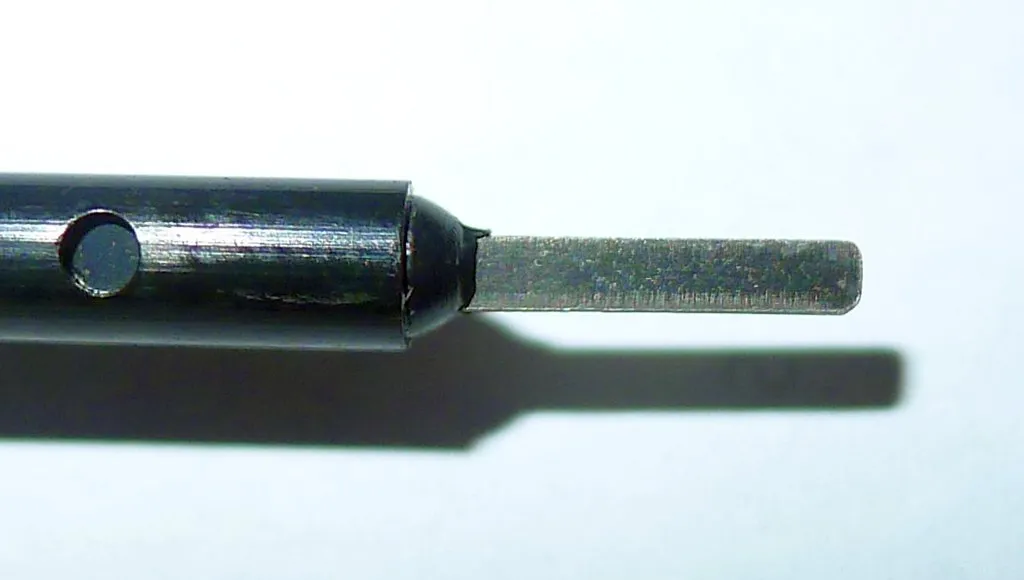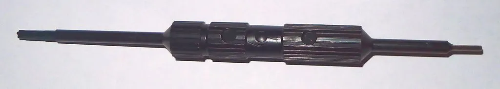 Trimgereedschap met een plastic kruiskop en hex stift aan één kant en een metalen plat blad aan de andere kant.
